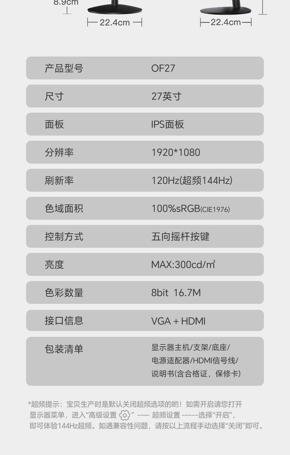 刷新率:120Hz (HDMI超频144Hz)